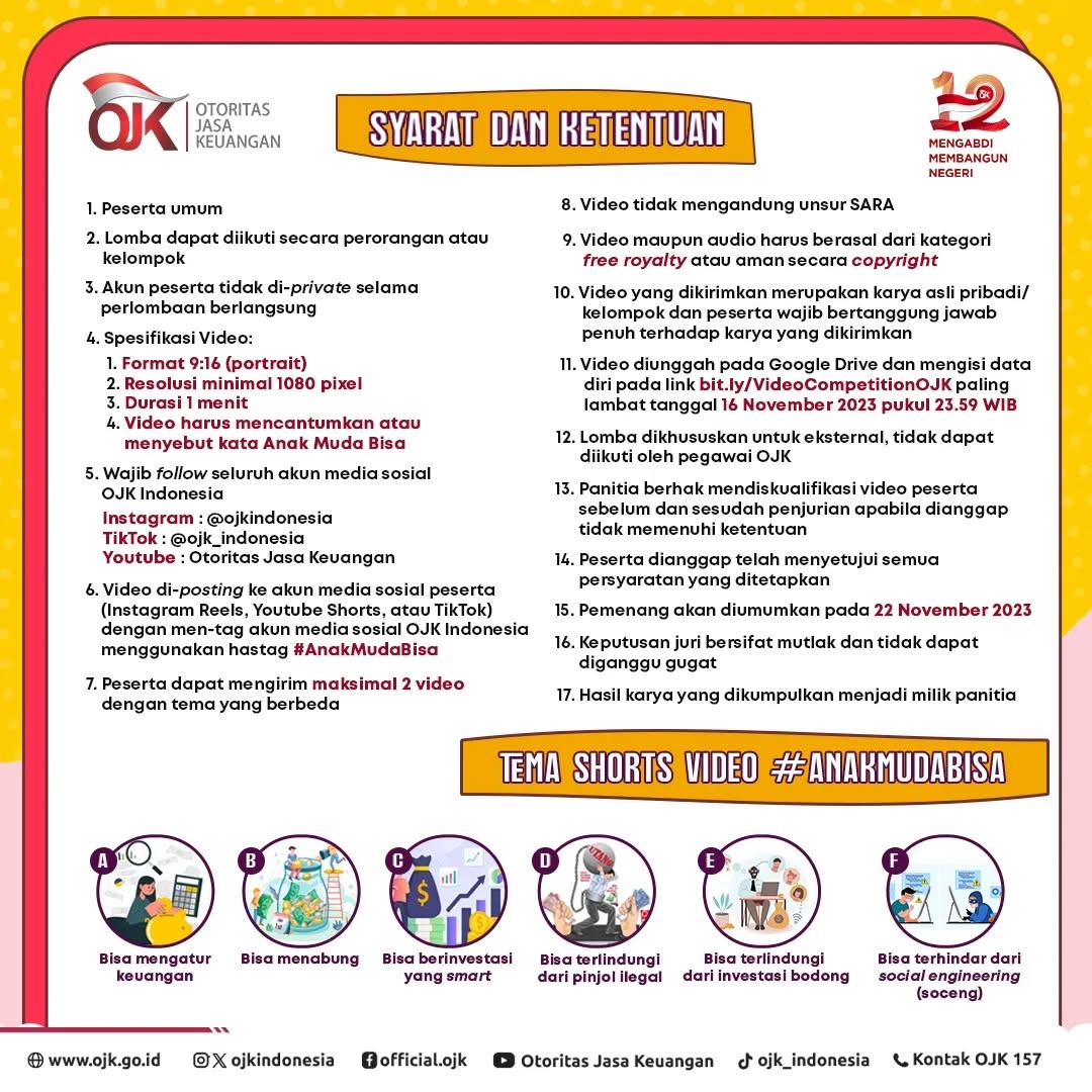 Sebagai bentuk dukungan terhadap literasi keuangan di kalangan generasi muda, MNS Group berkolaborasi dengan Otoritas Jasa Keuangan (OJK) menghadirkan aktivasi digital bertajuk Shorts Video Competition #AnakMudaBisa. Kompetisi ini mengajak anak-anak muda Indonesia untuk berkreasi melalui konten video pendek yang edukatif dan inspiratif, dengan total hadiah sebesar Rp21,5 juta rupiah.